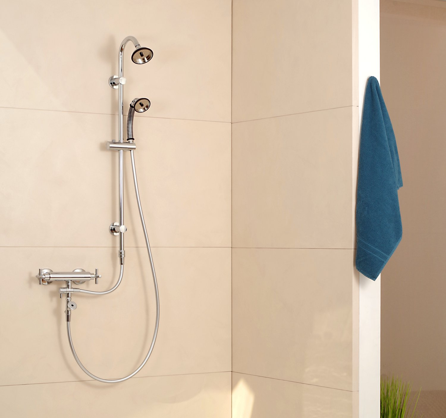 Damit die Brauselöcher dauerhaft frei von Kalk bleiben, sollte die Brause etwas schräg aufgehängt sein, damit das verbleibende Wasser aus dem Brausekopf auslaufen kann.