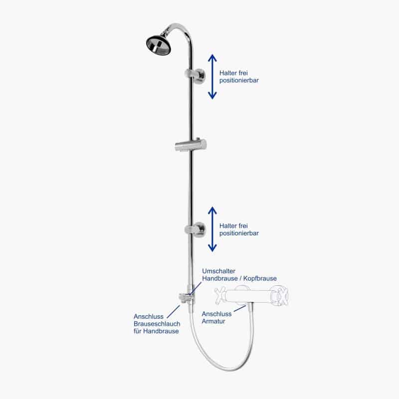 Dieses Duschsystem ist durch sein Konzept mit flexiblem Anschlussschlauch und frei verstellbaren Brausestangen-Haltern auch ideal zur Umrüstung von normalen Duschen mit Standard-Duschstangen. Dieses "Upgrade-Paket" ist ideal, wenn die BUBBLE-RAIN Handbrause und der Brauseschlauch schon vorhanden sind.